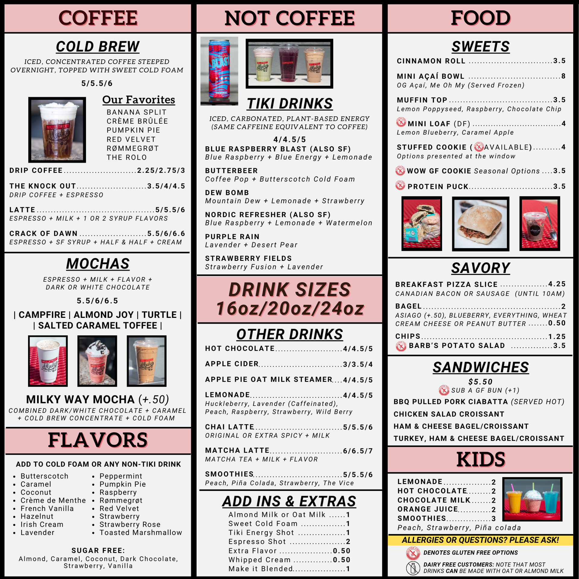 There's more than coffee around here. Choose from traditional coffee options (drip, espresso, lattes and frappes) or try something new. From smoothies to lemonade to Tiki drinks we have something for everyone. With and without caffeine. Kid's sizes through 20oz fuel-your-soul all day sizes. Click the menu to see which one is calling your name!